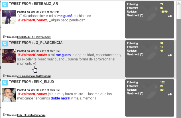 Si bien yo siempre he sido un activista contra basar todo un análisis en sentimiento y opiniones, no cabe duda de que en cuestión de casos de crisis y opinión es uno de los métricos más valiosos a medir. Aqui encontramos uno de los problemas de las herramientas de monitoreo: no hay análisis de sentimiento automático en español (al momento consideraría a Alterian y SocialMetrix como las opciones para ello pero para un caso de respuesta rápido no son todavía las mejores opciones; Sin embargo SocialMetrix me ha comentado que están en puertas para sacar una herramienta más ajustable y con mejor forma de reacción a este tipo de cosas)