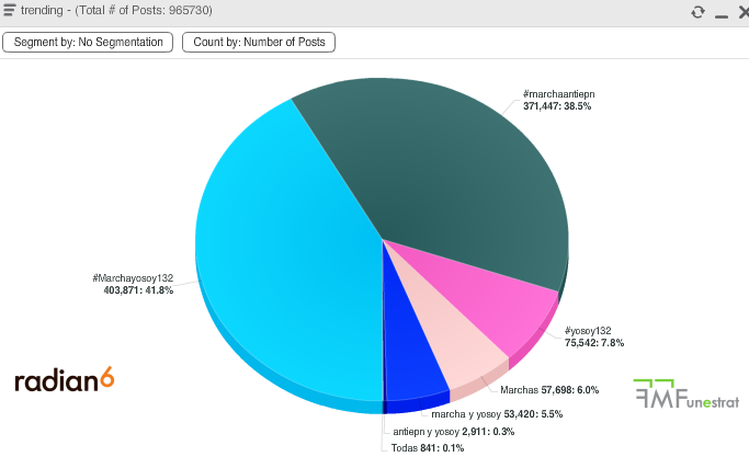 Como podemos ver en el tweet anterior hay 2 de los Hashtags monitorizados, para los sistemas de monitoreo esto contará como 2 menciones distintas si le pedimos segmentar los resultados para cada hashtag. Es decir, es 1 voto para #MarchaAntiEPN pero también 1 voto para #yosoy132. Si utilizamos Radian6 y pedimos esta segmentación de manera simple nos da: