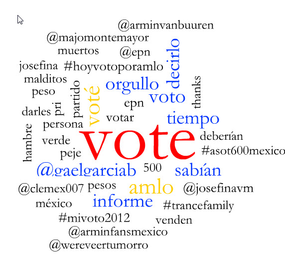#elecciones2012, elecciones 2012, #mivoto2012, #voto2012 así como algunas frases del verbo votar relacionado a los nombres más comunes de los candidatos como yo voto por EPN, yo voto por Peña, yo voto por AMlo, ya voté, votaré por, voté por, etcétera.