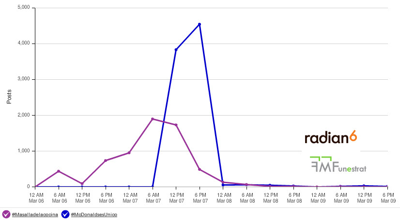 Y al comparar las tendencias en el tiempo como vemos en la imagen siguiente queda claro que el segundo Topic sustituye rápidamente al otro en la primera hora aunque nunca por completo y fue hasta que la conversación pasó de actualidad que ambos topics desaparecieron. Sin embargo notamos con un poco de sospecha el crecimiento tan fuerte y pronunciado del segundo topic mientras que #masalladelacocina creció de manera más orgánica de pronto el segundo se dispara.