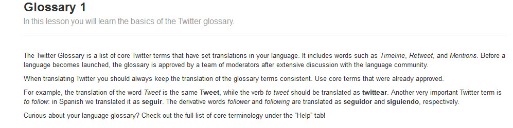 En primera me gustaría señalar que desde el 2009 fui invitado por Twitter a ser parte del equipo de traducción en formato de crowdsourcing de todo su sitio y documentos. No he sido el traductor más asiduo pero puedo decir con orgullo que colaboré en unos cientos de traducciones. Hoy en día el programa ya no es por invitación sino que cualquiera puede unirse aunque se tiene ya traducido casi al 100% todo documento de twitter.